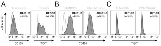 Figure 8. Analysis of expression of CD155 and TIGIT in primary tumor tissue. (A) Representative histograms of the flow cytometry analysis of CD155 and TIGIT abundance on tumor (GD2+/CD45−) and NK cells (GD2−/CD45+/CD56+) in the murine primary tumor tissue. Cells were stained with anti-murine anti-CD155 Ab and anti-murine anti-TIGIT Ab for tumor and NK cells, respectively (black-filled curve). Unstained cells served as negative controls (unst., grey curve). (B) Representative histograms of the flow cytometry analysis of CD155 abundance on two populations of tumor-infiltrating MDCSs (M-MDSCs, GD2−/CD45+/CD11b+/Ly6Chigh/Ly6G− and PMN-MDSCs GD2−/CD45+/CD11b+/Ly6Clow/Ly6G+). Cells were stained with anti-murine anti-CD155 Ab (black-filled curve). Unstained cells served as negative controls (unst., grey curve). (C) Representative histograms of the flow cytometry analysis of TIGIT abundance on two populations of tumor-infiltrating M- and PMN-MDSCs. Cells were stained with anti-murine anti-TIGIT Ab (black-filled curve). Unstained cells served as negative controls (unst., grey curve).