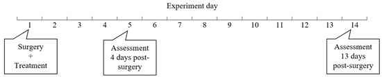 Research design. Sixteen Wistar rats were divided into two groups (N = 8); control received intraperitoneal saline after anastomosis, whilst the other group received BromAc® (experimental day 1). Half of the rats in each group (N = 4) were culled for assessment at 4 or 13 days post-surgery (experimental days 5 and 14, respectively).