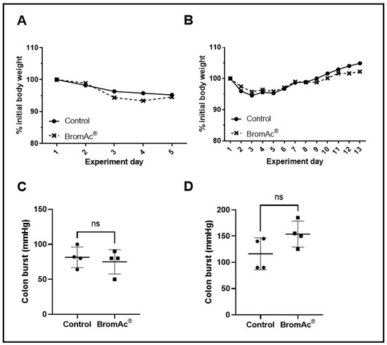 (A,B) Graphs show percentage changes in body weights of control and BromAc®-treated animals monitored for 4 and 13 days after colon-anastomosis surgery, respectively. (C,D) Graphs showing the potency of colon anastomotic burst pressure expressed by mmHg 4 days and 13 days post-colon-anastomosis surgery, respectively. Data presented as mean ± SD. Differences were considered statistically significant when p < 0.05, ns = not significant.