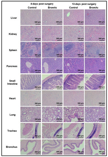 Microscopic histological images of liver, spleen, kidney, pancreas, and intestine stained with H&E. No abnormalities were detected upon histopathological evaluations when comparing BromAc®-treated group with sham control group 4- or 13-days post-surgery. Final magnification, ×100; scale bar = 300 µm.