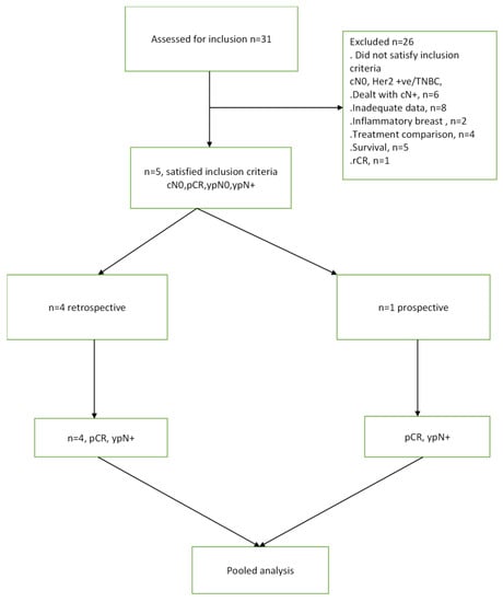 The literature search identified a total of 31 studies, out of which five studies met the predefined inclusion criteria (Figure 1). These selected studies encompassed a patient population of 3834 individuals who fulfilled the specified selection criteria [8,9,10,11,12]. Table 1 presents the tabulated information, including the author names, the number of patients (N) with cN0 TNBC or Her2 positive breast cancer who achieved pCR after NAST and frequency of nodal disease post-treatment (ypN+).