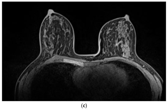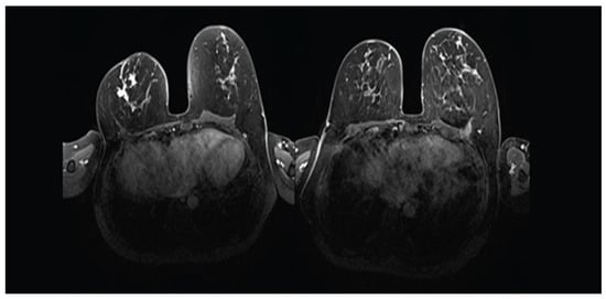 Patients with TNBC or HER2-positive disease are recognised to have the highest rates of pCR in the breast [1]. Tadros et al. have shown that pCR after NAST correlates with ypN0 [8]. Rates of breast pCR and ypN0 differ across tumor subtypes and are highest in HER2+ or TNBC [6]. This observation is also confirmed by van der Noordaa et al. [15]. Other predictors of achieving pCR include high tumor grade and high proliferation index. On the contrary, hormone-sensitive lobular breast cancer is associated with the lowest rate of pCR. However, accurate prediction of pCR remains challenging. The standard conventional imaging method for predicting pCR utilizes the combination of mammography with ultrasound [22]. However, breast magnetic breast imaging (MRI) seems to estimate the response of the primary tumor to NAST more accurately than conventional breast imaging [23], particularly in patients with HER2+ or TNBC (Figure 2 and Figure 3) [24]. Breast MRI has received the highest accuracy rating (rated 9) by the American College of Radiologists [25]. Furthermore, when considering patients with triple-negative or HER2-positive breast cancer who achieve a complete or partial response on breast imaging, the prediction of pCR can be improved by sampling the index breast area. Accuracy of 98% with an FNR of 5% has been achieved with vacuum-assisted core biopsy (9-gauge), obtaining 12 cores, in addition to fine needle aspiration cytology after NAST [26].