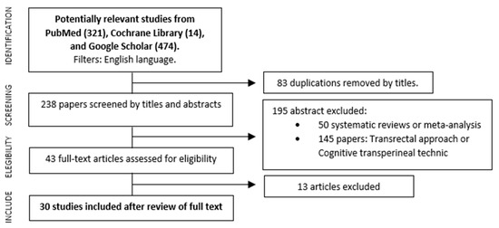 A total of 321 references were initially identified, however, 83 of them were first excluded due to duplicated titles. After the analysis of abstracts, another 50 were discarded because they were narrative or systematic reviews and meta-analyses, and then 145 studies, analyzed via the transrectal approach or cognitive transperineal technic, were removed as well. Finally, 43 articles were identified, which complied reports on series of biopsies performed using the image fusion software through the transperineal route; 30 out of these 43 met the PICO selection criteria. The PRISMA study selection flowchart is summarized in Figure 1.