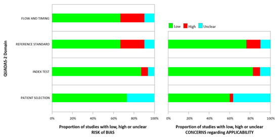 - Whiting, P.F.; Rutjes, A.W.; Westwood, M.E.; Mallett, S.; Deeks, J.J.; Reitsma, J.B.; Leeflang, M.M.; Sterne, J.A.; Bossuyt, P.M.; QUADAS-2 Group. QUADAS-2: A revised tool for the quality assessment of diagnostic accuracy studies. Ann. Intern. Med. 2011, 155, 529–536. [Google Scholar] [CrossRef]
