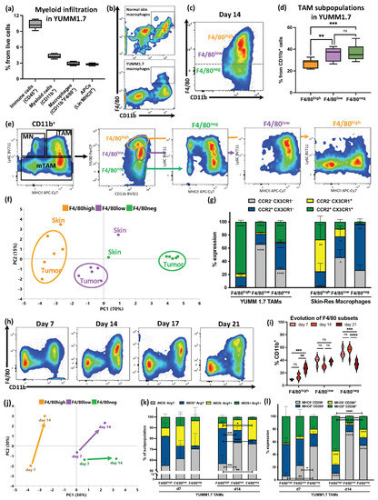 3.1. F4/80 Expression Defined YUMM1.7 Melanoma TAM Subsets with Partial Similarities with Skin-Resident Macrophages That Evolved during Tumor Progression