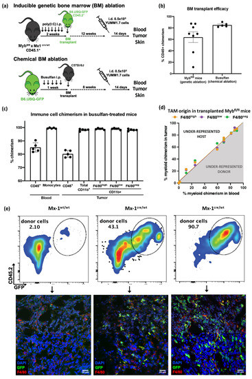 Given the partial similarities between melanoma TAMs and skin-resident cells, in addition to the observations made in other tumor types [13,16,17,36], we further investigated the TAM ontogeny to better understand their immune function. For this, we used two strategies to track BM precursors and tumor infiltration (Figure 2a and Figure S2a). Chemical BM ablation induced by busulfan generated a model with an almost complete and homogenous BM transplant, while the genetic depletion of the Myb+ BM precursor generated a graded engraftment success, allowing for an evaluation of the potential competition between host and donor cells (Figure 2b and Figure S2b). The busulfan-treated mice showed significantly better myeloid cell engraftment, observed in the circulation, which allowed us to evaluate the F4/80 TAM origin.