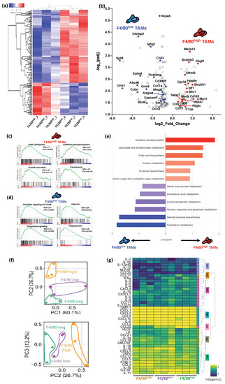 We further identified differences between the cellular and metabolic programs of the F4/80high and F4/80low TAM subsets. Gene-set enrichment analysis (GSEA) (Supplementary Figure S3d) revealed that the F4/80high TAMs had upregulated oxidative phosphorylation, with increased expression of Igf1 and Cd38, and lipid metabolism through the peroxisome pathway, while also showing increased proliferation pathways, such as the G2M checkpoint, as well as protein secretion (Figure 3b,c,e and Figure S3d,e). In contrast, the F4/80low cells were enriched for proinflammatory signaling pathways, such as TNFα signaling via NFκB, IFNα, and IFNγ signaling, along with responses to hypoxia and angiogenesis. These also showed expression of glycolysis-associated ABC- and glutamate-transporter genes, along with upregulated glycolysis KEGG metabolic pathways (Figure 3d,e and Figure S3e). These results highlighted important differences in terms of the metabolic heterogeneity, proliferative capacity, and self-renewal of the YUMM1.7 melanoma TAMs.