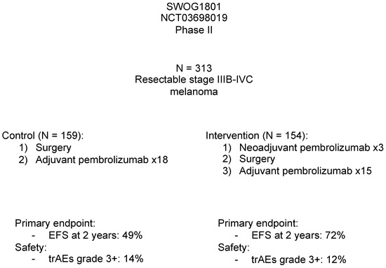 In the Southwest Oncology Group S1801 trial, Patel et al. compared neoadjuvant and adjuvant pembrolizumab with purely adjuvant pembrolizumab in patients with stage IIIB to IVC melanoma (Figure 2). The combination arm received three doses of neoadjuvant pembrolizumab (200 mg), followed by surgery and 15 adjuvant doses. The purely adjuvant arm received 18 doses of pembrolizumab after surgery. The primary endpoint in this trial was event-free survival (EFS) at two years. The study demonstrated that the neoadjuvant/adjuvant arm had a significantly longer EFS at 2 years, 72%, versus 49% in the adjuvant arm (p = 0.004). The two groups did not differ in the rates of serious adverse events (12% vs. 14%), suggesting neoadjuvant/adjuvant therapy was well-tolerated compared with standard-of-care. More importantly, the study directly addressed the question of treatment sequence and provided the first evidence highlighting the superiority of neoadjuvant over adjuvant therapy in preventing relapses [48].
