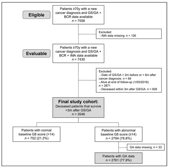 - Kenis, C.; Decoster, L.; Flamaing, J.; Debruyne, P.R.; De Groof, I.; Focan, C.; Cornelis, F.; Verschaeve, V.; Bachmann, C.; Bron, D.; et al. Adherence to geriatric assessment-based recommendations in older patients with cancer: A multicenter prospective cohort study in Belgium. Ann. Oncol. 2018, 29, 1987–1994. [Google Scholar] [CrossRef] [PubMed]