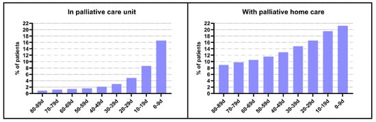 - Jordan, R.I.; Allsop, M.J.; ElMokhallalati, Y.; Jackson, C.E.; Edwards, H.L.; Chapman, E.J.; Deliens, L.; Bennett, M.I. Duration of palliative care before death in international routine practice: A systematic review and meta-analysis. BMC Med. 2020, 18, 368. [Google Scholar] [CrossRef] [PubMed]