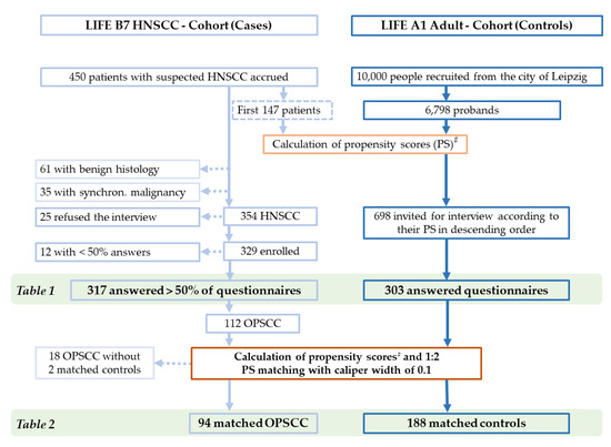 The LIFE A1 Adult Study of the Leipzig Research Centre for Civilization Diseases (LIFE [9,10]) is a large population-based cohort study. Within LIFE, a total of 10,000 adults were scheduled to be recruited randomly from the City of Leipzig (cohort A1) to serve as a control sample for various diseases, including HNSCC. The sub-project LIFE B7 HNSCC [10,11] was a cohort study in the framework of the same population-based cohort study LIFE, and it was conducted according to the guidelines of the Declaration of Helsinki and approved by the Ethics Committee of the University Leipzig (votes 201-10-12072010 and 202-10-12072010). The LIFE study provided a rationale to identify a nested sample of n = 300 volunteers from the LIFE A1 Adult study to serve as controls for our cohort of HNSCC patients to allow for the identification of risk factors for HNSCC and to gain information about gene–environment interaction not only of well-known risk factors (alcohol and smoking) by additionally investigating other lifestyle factors potentially involved in HNSCC etiology, including sexual behavior. From 4 August 2010 to 18 July 2012, we enrolled a total of n = 450 patients who were suspected of having head and neck cancer. A cross-sectional comparison of HNSCC patients (cases from B7) and controls without HNSCC (from A1) was designed as a nested case-control study with 1:1 matching. We used the main risk factors for HNSCC—male sex, chronologic age, alcohol consumption, and tobacco smoking history (pack years smoked)—of the first 147 patients accrued to calculate PSs in B7 and all 6798 A1 participants at that time. With a scheduled sample size of 300, we consecutively invited A1 participants according to their PS, in descending order, to have the same interview used in B7 (Figure 1). According to weekly sent invitations, 303 out of the 698 highest-scoring A1 controls responded (response rate 43.4%), provided informed consent, and completed the interview to serve as a reference.