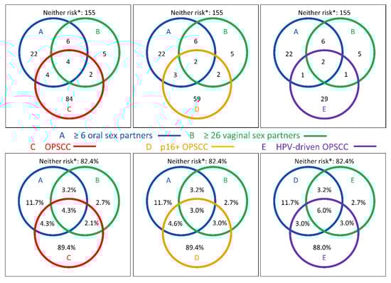 Venn diagrams showing the distribution of self-reported high-risk sexual behavior (HR-SB) among N = 188 propensity-score-matched healthy adults and among N = 94 oropharyngeal squamous cell carcinoma (OPSCC, C; red circles, left) patients, the subgroup of n = 66 p16-positive OPSCC patients (D, orange circles, middle), and n = 33 HPV-driven (p16+ ≥70%, HR-HPV DNA+) OPSCC patients (E, purple circles, right) according to numbers (upper row) and percentage (lower row) regarding the number of oral-sex partners ≥ 6 (blue) and number of vaginal-sex partners ≥ 26 (green). * Neither risk depicts PS-matched controls without HR-SB and OPSCC. Please note that there is no adjustment of diameters for proportionality.