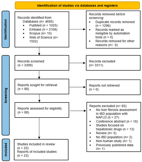 The flow diagram of study retrieval for the systematic review is detailed in Figure 1. A total of 4695 records were identified from databases (PubMed 1025, Embase 2108, Scopus 10, and Web of Science 1552). After electronically removing duplicate records, 3399 records were reviewed by title and abstract excluding 3311 of them. Eighty-eight full-texts were reviewed, excluding 65 additional reports being the most frequent reasons: lack of liver fibrosis assessment in IBD population with NAFLD (n = 27), conference abstracts (n = 18), and studies focused on patients receiving hepatotoxic drugs (n = 13). Finally, 23 studies were included in the systematic review [10,11,12,16,31,32,33,34,35,36,37,38,39,40,41,42,43,44,45,46,47,48,49].