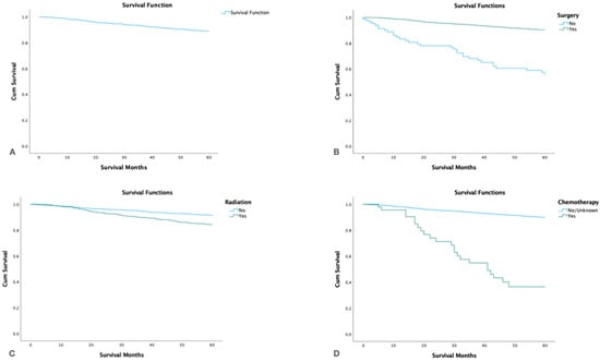 Kaplan Meier survival graphs by treatment modality: (A): Survival of the entire cohort. (B). Survival by surgery. (C). Survival by radiotherapy. (D). Survival by chemotherapy.