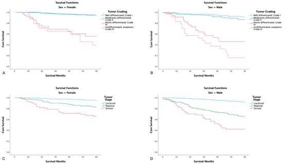 Stratifying by grade and gender showed that males with high tumor grade had lower survival rates than females (p < 0.001). Males also had lower survival rates than females in all stages (localized, regional, distant) (p < 0.001) (Figure 5).