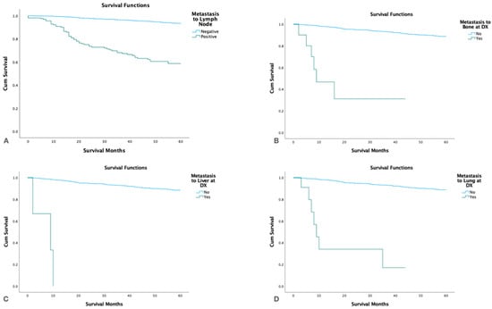 Kaplan Meier survival graphs by metastatic site at the time of diagnosis. (A). Lymph nodes, (B). Bone, (C). Liver, (D). Lungs.