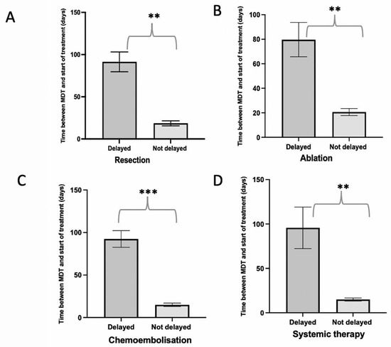 Effect of the 3-month COVID-19 complete lockdown on treatment waiting times across all HCC treatments. Bar graphs illustrate the effect on COVID-19 lockdown on time between decision to treat (DTT) MDM date and start date of treatment across treatments. In panels (A–D), the bars represent the mean time between MDM DTT and start of treatment, and the error bars represent the standard error of the mean (SEM). Statistically significant data comparisons with p < 0.01 are denoted with ** and p < 0.001 are denoted with ***. Delay in treatment was defined according to the 31 days NHS target.