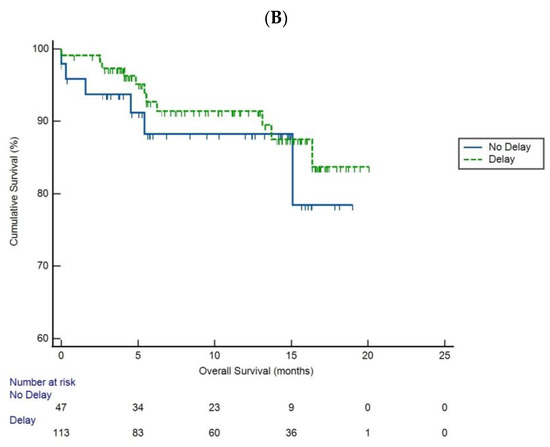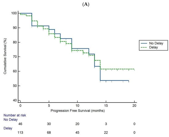 Kaplan–Meier curves illustrating the impact of delayed treatment on (A) progression-free survival (PFS) and (B) overall survival (OS) in HCC with patients diagnosed during COVID-19 complete lockdown period.