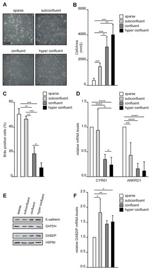 To explore if DAB2IP levels are regulated by cell density, we seeded MCF10A mammary epithelial cells at different concentrations. We aimed to achieve the maximum density that would preserve a monolayer distribution—from now on confluency, or max 2D density (Figure 1A). Cell confluency was monitored qualitatively by checking the free space between cells and quantified by counting the number of nuclei per area (Figure 1B). We analyzed DNA synthesis by BrdU incorporation, confirming that confluency correlated with a significant reduction in cell proliferation (Figure 1C). Next, we assessed the activity of the co-transcriptional factors YAP and TAZ, which are sensitive to contact inhibition [26]. As expected, YAP/TAZ target genes CYR61 and ANKRD1 were downregulated at confluency (Figure 1D). Finally, the increase in cell density was paralleled by a gradual accumulation of E-cadherin (Figure 1E) [27,28].