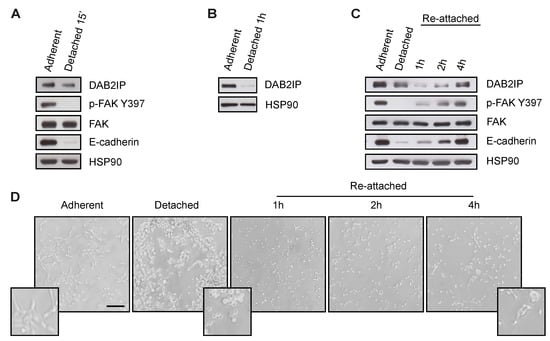 We asked whether DAB2IP levels would decrease when cell interactions are disrupted. We first detached subconfluent MCF10A cells from the culture dish by Trypsin/EDTA treatment. We observed a significant reduction of DAB2IP protein, along with the expected reduction of E-cadherin levels and FAK activity (Figure 2A). DAB2IP downregulation was even more striking when the experiment was done with confluent MCF10A detached and kept in suspension for 1 h (Figure 2B). When detached cells were re-plated on plastic, there was a progressive recovery of DAB2IP protein, as well as E-cadherin levels and FAK activity (Figure 2C,D), suggesting that cell interactions and/or mechanical activation support DAB2IP expression.