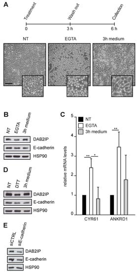 Cell–cell interactions sustain DAB2IP protein levels. (A–C) DAB2IP protein levels and YAP/TAZ activity are reversibly affected by EGTA treatment. MCF10A cells were seeded at high density (60,000 cells/cm2) and cultured for 48 h until confluence. Cells were treated with 10 mM EGTA for 3 h, then fresh medium was added for an additional 3 h. (A) Schematic protocol and representative pictures of cells at the indicated time points (scale bar = 200 µm). (B) DAB2IP and E-cadherin levels were detected by immunoblotting, with HSP90 as a loading control. (C) Expression of CYR61 and ANKRD1 was measured by RT-qPCR. Data are normalized on histone H3 (mean ± SD; n = 3; * p < 0.05, ** p < 0.01). (D) DAB2IP protein levels are reversibly affected by DTT treatment. MCF10A cells were cultured and treated exactly as in A, using 10 mM DTT instead of EGTA. DAB2IP and E-cadherin levels were detected by immunoblotting, with HSP90 as a loading control. (E) E-cadherin depletion reduces DAB2IP protein in confluent cells. MCF10A were transfected with the indicated siRNAs, then seeded (60,000 cells/cm2) and cultured for an additional 48 h to confluent condition. DAB2IP and E-cadherin levels were detected by immunoblotting, with HSP90 as a loading control.
