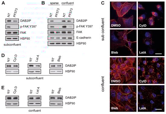 Cell junctions mechanically associate the cytoskeleton with the surrounding environment, controlling specific biochemical and transcriptional responses. We, therefore, evaluated the role of the actin cytoskeleton in the observed DAB2IP regulation. We first treated MCF10A cells with the FAK inhibitor PF573228 (PF573) which decreases focal adhesion turnover and destabilizes actin filaments, lowering the tensional state of the cytoskeleton [31]. Notably, treatment with PF573 reduced DAB2IP in subconfluent and sparse cells, but not in cells at high density (Figure 4A,B), suggesting that FAK activity is important to sustain DAB2IP levels in low density, but is dispensable in confluent cells.