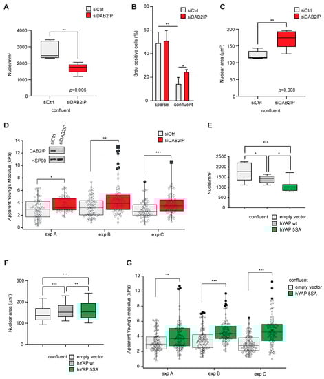 Given its upregulation with cell density, we analyzed the impact of DAB2IP depletion in different confluence conditions. Subconfluent MCF10A cells display luminal ductal features [32]; upon DAB2IP knockdown, they change their morphology, tend to be more spread on the culturing surface and acquire a spindle-like shape (Figure S4A—left panels). This phenotype is in line with features of EMT and invasive behavior observed by others in DAB2IP-depleted MCF10A [15]. In confluent monolayers, DAB2IP-depleted MCF10A cells are morphologically similar to controls but less tightly packed (Figure S4A, right panels). Specifically, DAB2IP knockdown cells reproducibly displayed a lower number of nuclei per area (Figure 5A and Figure S4B), and an increased proliferation index as measured by BrdU incorporation (Figure 5B). Notably, confluent DAB2IP knockdown cells also showed increased nuclear area (Figure 5C and Figure S4B). Such features may suggest a change in the mechanical properties of confluent cells; analysis based on Atomic Force Microscopy (AFM) confirmed that DAB2IP-depleted cells have a higher elastic module than controls, indicative of greater cell stiffness (Figure 5D).