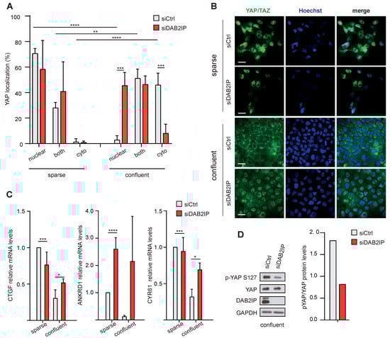 DAB2IP depletion allows YAP/TAZ activation in confluent cells. (A,B) DAB2IP depletion increases YAP/TAZ nuclear localization in confluent cells. MCF10A cells were transfected and seeded as described in Figure 5. The cellular distribution of YAP was analyzed by immunofluorescence. (A) Graph summarizes the percentage of cells with YAP staining in the nucleus, cytoplasm, or both compartments (mean ± SD; n = 4; ** p < 0.01, *** p < 0.001, **** p < 0.0001). (B) Representative images of YAP/TAZ (green) localization by immunofluorescence. Scale bar = 20 µm. (C) DAB2IP depletion increases the expression of YAP/TAZ target genes in confluent cells. MCF10A cells were treated as in A. Expression of CTGF, ANKRD1 and CYR61 was measured by RT-qPCR. Data were normalized on histone H3 (mean ± SD; n = 3; * p < 0.05, *** p < 0.001, **** p < 0.0001). (D) DAB2IP depletion reduces YAP Ser127 phosphorylation in confluent cells. MCF10A cells were cultured as in A. DAB2IP, phosphorylated (p-S127) and total YAP were detected by immunoblotting, with GAPDH as loading control. Protein bands were quantified and normalized to GAPDH by densitometry of autoradiography film (histogram on the right).