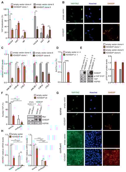 Since DAB2IP depletion appears to activate YAP/TAZ in confluent cells, a condition in which they are normally inhibited, we asked if DAB2IP overexpression would inhibit YAP/TAZ in culture conditions in which they are normally active. To this aim, we generated cell lines stably expressing hDAB2IP. Under standard culture conditions (i.e., subconfluent), hDAB2IP overexpression increased YAP cytoplasmic retention in two independent clonal cell lines (Figure 7A,B). Accordingly, YAP/TAZ target genes were also less expressed (Figure 7C).
