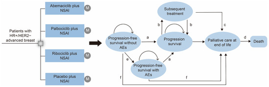 Markov model structure for cost-effectiveness analysis. Markov model depicting the four first-line treatment arms and the transition between Markov states, illustrating the disease development process of HR+/HER2− ABC. (a) Progression-free survival without AEs; (b) progression survival; (c) overall survival after progression; (d) death; (e) progression-free survival with AEs; (f) first-line overall survival. NSAI, letrozole/anastrozole; AEs, adverse events.