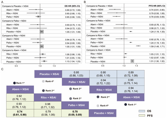 Based on our results from the NMA, the three first-line CDK4/6 inhibitors plus NSAI provided PFS and OS superiority to placebo + NSAI. Among the three CDK4/6 inhibitors plus NSAI groups, Abem + NSAI represented a significant statistical advantage regarding PFS (HR 0.74, 95% CI 0.61–0.90, p = 0.009) and indicated a trend of having the best OS benefit (HR 0.89, 95% CI 0.72–1.08); however, the results of the OS should be interpreted with caution since no significant statistical difference was found.