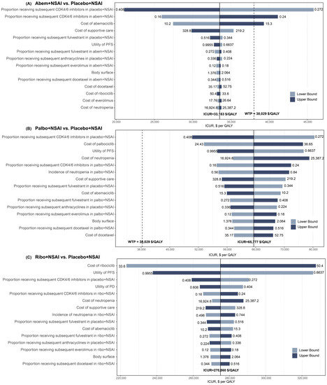 Tornado diagrams derived from the one-way sensitivity analyses. (A) Abem + NSAI vs. placebo + NSAI; (B) Palbo + NSAI vs. placebo + NSAI; (C) Ribo + NSAI vs. placebo + NSAI. The black solid line represents the ICURs. The dashed line represents the WTP threshold in China ($38,029/QALY).