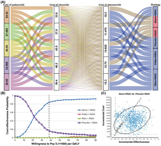 The pairwise one-way sensitivity analyses showed that some model variables had a significant influence on the results of Abem + NSAI compared with placebo + NSAI, which are presented in Figure 3. Varying the proportion of the received subsequent CDK4/6 inhibitors and the cost of Abem had a substantial impact on the outcomes of the model in the comparison across the Abem + NSAI and placebo + NSAI groups. Of note, when the proportion of receiving subsequent CDK4/6 inhibitors in the placebo + NSAI group decreased to 0.272, the proportion of receiving subsequent CDK4/6 inhibitors in the Abem + NSAI group increased to 0.24, and the costs of Abem increased to 15.3, the ICURs were higher than the WTP of $38,029/QALY (Figure 3A). Compared to the placebo + NSAI group, irrespective of the changes in the model parameters, the ICURs of the Palbo + NSAI and Ribo + NSAI groups were higher than the WTP, validating the robustness of our model (Figure 3B,C). The three-way sensitivity analyses indicated that, when the cost of Palbo, Ribo, and Abem changed simultaneously, the most cost-effective strategy was selected as being between the Abem + NSAI and placebo + NSAI groups. This result revealed that the prices of CDK4/6 inhibitors exert great influence on the main outcomes (Figure 4A). In the cost-effectiveness acceptability curves, the probabilities that the Abem + NSAI group was cost-effective increased as the WTP threshold increased (Figure 4B). The probability of Abem + NSAI being cost-effective was 81.3% at the WTP threshold of $38,029 per QALY (Figure 4C). The more detailed incremental cost-effectiveness scatterplots are shown in Supplementary Figure S6.
