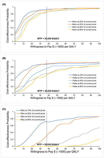 One-way sensitivity analyses demonstrated that, when the proportion of receiving subsequent CDK4/6 inhibitors in the placebo + NSAI group decreased to 0.272, the proportion of receiving subsequent CDK4/6 inhibitors in the Abem + NSAI group increased to 0.24, and the costs of Abem increased to 15.3, the ICURs were higher than the WTP of $38,029/QALY. The possible reasons for the proportion of subsequent CDK4/6 inhibitors and the cost of Abem influencing the outcomes were the relatively higher prices of CDK4/6 inhibitors and a small difference between the values of the ICUR and WTP, which led to the greater possibility that ICUR exceeds the WTP. Three-way sensitivity analyses indicated that, when the cost of Palbo, Ribo, and Abem changed simultaneously, the most cost-effective strategy was selected to be between the Abem + NSAI and placebo + NSAI groups. In the cost-effectiveness acceptability curves, the probability that the Abem + NSAI group was cost-effective increased as the WTP threshold increased. The sensitivity analyses indicated that the prices of CDK4/6 inhibitors had a great impact on the results, so we further simulated the impact of different prices on the results. The change in the price of Abem has no obvious impact on the cost-effective benefit of the Abem + NSAI group. Palbo + NSAI will be cost-effective when the price of Palbo reduces to half of the current value. Ribo + NSAI could be a cost-effective strategy when the price of Ribo decreases to 10% of the current price. The use of CDK4/6 inhibitors has been the first-line treatment paradigm for HR+/HER2− breast cancer. However, the affordability of drugs needs to be taken into account to avoid lower drug utilization due to the prices. From our results, the use of CDK4/6 inhibitors will be encouraging if the drug prices are lowered, as this could improve the affordability of the drug to patients and the government. This conclusion may guide future price adjustments for CDK4/6 inhibitors.