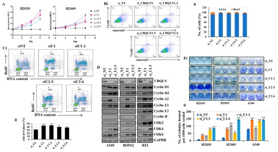 Loss of UBQLN1 and UBQLN2 increases cell viability, cell proliferation, cell cycle progression, and clonogenic potential in lung adenocarcinoma cells. (A) Cell viability assay in H2030 and H2009 cells. Cells were transfected as indicated. After 24 h of transfection, cells were trypsinized and 1000 cells were reseeded in 96-well plates and cell viability was assessed for 5 consecutive days. (Bi,ii) AnnexinV and 7AAD staining in A549 cells. Cells were prepared as described in methodology followed by incubation with AnnexinV antibody for one hour. After subsequent washing, cells were incubated with 7AAD and analyzed for apoptosis by flow cytometry analysis. (Ci,ii) Cell proliferation assay in A549 cells. Cells were prepared as described in methodology followed by incubation with anti-BrdU antibody for one hour. After subsequent washing, cells were incubated with 7AAD and analyzed by flow cytometry analysis. (D) Western blot analysis of cell cycle progression markers in A549, HOP62, and H23 cells. (Ei,ii) Clonogenic assay in H2030, H2009, and A549 cells (* p < 0.05, ** p < 0.01). The original western blots is Figure S1.