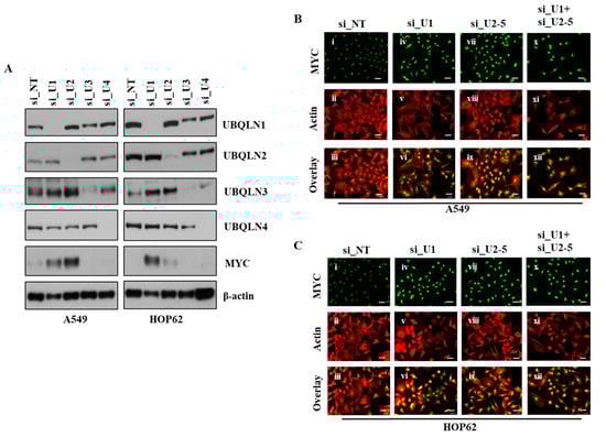 Loss of UBQLN1 and UBQLN2 increases MYC activity and expression of MYC. (A) Western blot analysis of UBQLNs and MYC in A549 and HOP62 cells. (B,C) Fluorescence staining for MYC in A549 and HOP62 cells. After 24 h of transfection either with non-targeting siRNA (si_NT) or with siRNAs targeting UBQLN1 (si_U1), siRNA targeting UBQLN2 (si_U2-5) or a combination of siRNA targeting UBQLN1 and UBQLN2 (si_U1+si_U2-5), cells were trypsinized and plated on chamber slides and stained for MYC. i, iv, vii and x: MYC was detected using Alexa Fluor 488 goat anti-rabbit IgG (green). ii, v, viii and xi: F-actin was stained with Alexa Fluor 568 Phalloidin (red), scale bar: 50 µm. iii, vi, ix and xii: overlay of respective MYC and F-actin staining with DAPI counterstain. The original western blots is Figure S2.