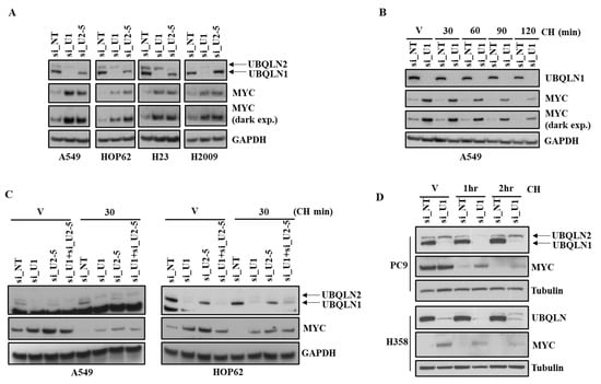 The following supporting information can be downloaded at: https://www.mdpi.com/article/10.3390/cancers15133389/s1, Figures S1–S6 are the original western blots. Figure S7: Western blot analysis confirming knockdown of UBQLN1 and UBQLN2 in HPL1D cells. Loss of UBQLN1 increased expression of cyclin D3, B1 and MYC in HPL1D cells. Figure S8: Western blot analysis confirming knockdown of UBQLN1 and UBQLN2 in H2030 and H2009 cells.