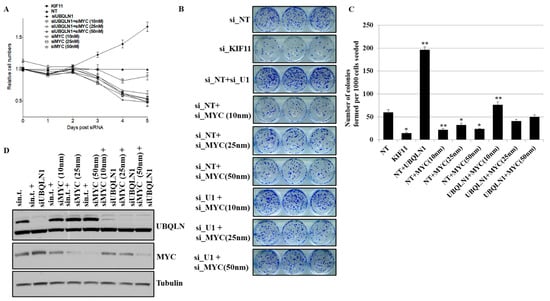 Partial loss of MYC reverse increased in cell viability and clonogenic potential following loss of UBQLN1. (A) Cell viability assay in A549 cells. (B) Clonogenic potential in A549 cells. Relative number of colonies formed per 1000 cells seeded were counted. (C) Quantification of relative number of colonies formed per 1000 number of cells seeded in B (* p < 0.05, ** p < 0.01). (D) Western blot analysis of MYC confirming knockdown in A549 cells. The original western blots is Figure S5.