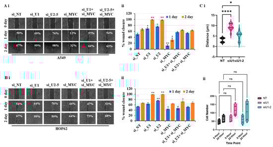 The mesenchymal phenotype is characterized by an increase in migratory and invasive properties [19,20,21,22]. In our study, involving lung adenocarcinoma cell lines, including A549 and HOP62, we observed that the loss of UBQLN1 and UBQLN2 increases cell migration. We hypothesize that an increase in cell migration is associated with an increase in the expression of MYC. We were interested to see whether the partial loss of MYC could reverse cell migration following the loss of UBQLN1 and UBQLN2. We performed a cell migration assay following a combined siRNA-mediated knockdown of either UBQLN1 or UBQLN2 with MYC in lung adenocarcinoma cell lines A549 and HOP62. Interestingly, we observed partial loss of MYC-reversed cell migration following the loss of UBQLN1 or UBQLN2 alone (Figure 6(Ai,Aii),(Bi,Bii)). These results further confirm the critical balance between UBQLN1 or UBQLN2 and MYC driving cell migration in lung adenocarcinoma cells. We further confirmed our finding that the loss of UBQLN1 drives cell migration in lung adenocarcinoma cells due to cell mobility and not due to cell proliferation by performing a single-cell mobility assay using a Keyence live cell imager. Following siRNA transfections either with non-targeting siRNA or with two different siRNA targeting UBQLN1 (siU1 and siU1-2), cell mobility was analyzed for 24 h. We observed a significant increase in cell mobility following the loss of UBQLN1 when compared to cells transfected with non-targeting siRNA (Figure 6(Ci)). Interestingly, when we analyzed cells for differences in proliferation, we did not see any significant difference following the loss of UBQLN1 (Figure 6(Cii)).