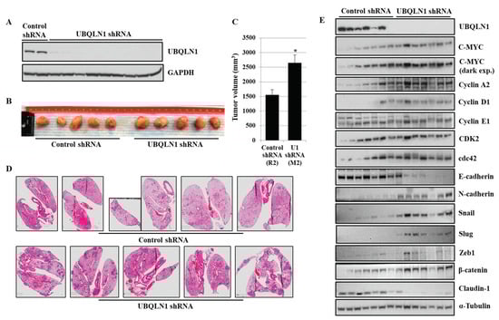 Using lung adenocarcinoma cell lines, we observed an increase in cell viability, clonogenic potential, and cell migration following the loss of either UBQLN1 or UBQLN2, which was associated with an increase in MYC expression. Next, we were interested to see whether our in vitro findings can be recapitulated in vivo. To explore this possibility, using lentiviral infections, we generated A549 cells stably expressing either UBQLN1 shRNA or control shRNA. Knockdown of UBQLN1 in generated A549 cell line was confirmed by performing a western blot analysis (Figure 7A). Following subcutaneous inoculations of generated cell lines, we observed an increase in tumor volume (Figure 7B,C) and lung metastasis in mice injected with A549 cells expressing UBQLN1 shRNA compared to mice injected with A549 cells expressing control shRNA (Figure 7D). Western blot analysis further confirmed our in vitro findings of an increase in tumorigenesis and lung metastasis in mice injected with A549 cells expressing UBQLN1 shRNA is associated with an increase in MYC expression and proteins involved in cell cycle progression (Figure 7E). We further investigated expression levels of key proteins including E-cadherin, Claudin1, N-cadherin, Slug, Zeb1, and β-catenin, which are known for their important role in the regulation of EMT. We observed a decrease in the expression of epithelial markers including E-cadherin, Claudin-1, and an increase in the expression of mesenchymal markers including N-cadherin, Snail, Slug, Zeb1, and β-catenin following the loss of UBQLN1. These in vivo findings further confirmed that the loss of UBQLN1 drives EMT in lung adenocarcinoma (Figure 7E).