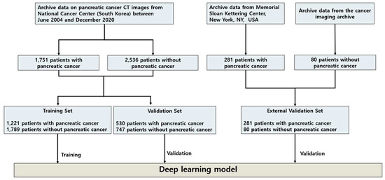 In this retrospective diagnostic study, we analyzed CT images acquired from the following datasets: the National Information Society Agency (NIA)-funded Medical Big Data Construction Project, the Medical Segmentation Decathlon, and the Cancer Imaging Archive (TCIA). The NIA-funded project included CT images of PC and normal pancreatic tissues from the NCC and seven general tertiary hospitals in South Korea. PC was defined as histologically or cytologically confirmed pancreatic adenocarcinoma. Benign pancreatic disease included pancreatic cystic lesions and acute or chronic pancreatitis, with a 1-year follow-up period. Images in which no lesions were observed were selected based on the radiologist’s report (a negative or unremarkable pancreas) as the normal pancreas set from participants who underwent a health checkup or treatment for anything other than pancreatic disease.