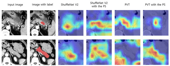 The CNN-based model with PS demonstrated improved sensitivity, specificity, precision, F1 score, and AUC compared to the model without PS. Additionally, the transformer-based model with PS exhibited even greater enhancements in performance, surpassing the transformer-based model without PS by 5.1% in accuracy, 1.9% in sensitivity, 3.2% in specificity, 15.4% in precision, 0.15 in F1 score, and 0.07 in AUC. From these results, implementing the proposed PS can improve all evaluation metrics on both CNN-based and transformer-based DL models for PC classification. In other words, PS can improve the prediction reliability of the DL models to be more similar to experienced radiologists (ground truth). Furthermore, Figure 3 shows representative CT images overlaid with heat maps produced by the gradient-weight class activation map (Grad-CAM) [42].