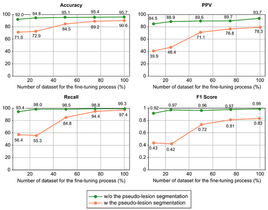 To evaluate the robustness of the self-supervised learning with PS for small datasets, we randomly sampled 10%, 25%, 50%, and 75% of the entire training dataset and trained PVT with and without PS using these selected datasets. Figure 4 presents performance changes depending on the size of the annotated dataset. PS shows a remarkable increase in the classification performance of the DL model for small datasets (10% and 25% datasets).