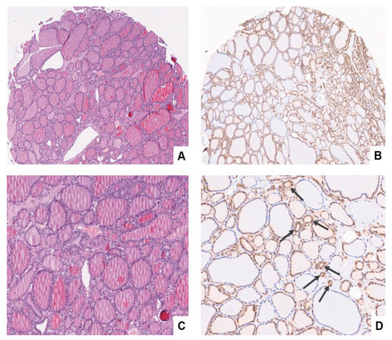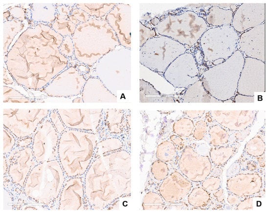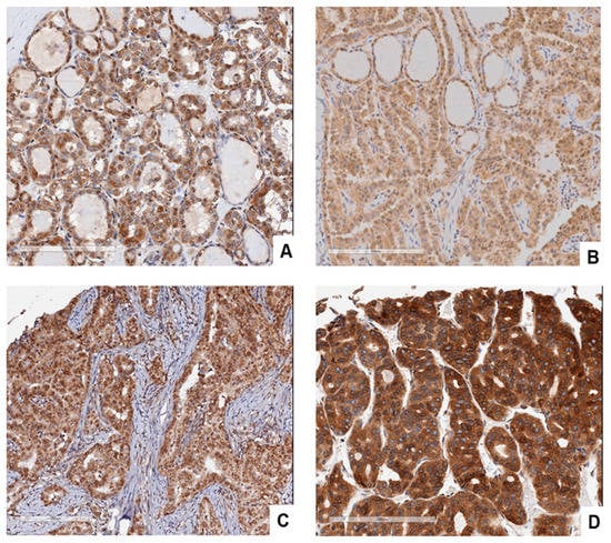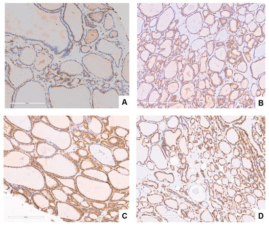We have previously reported that GASP-1 overexpression is required for breast cancer progression and invasion [23,24,25,26]. Breast cancer cells cannot grow or invade if GASP-1 expression is silenced. Thyroid follicular cells are known to be present in either resting (inactive) or metabolically active stage [3]. We decided to examine GASP-1 expression in different normal thyroid follicular cells using immunohistochemical staining with hematoxylin and GASP-1. Because GASP-1 is synthesized on the endoplasmic reticulum (ER), which is attached to the nucleus, the nucleus will initially appear as brown stain when GASP-1 is expressed there. Follicular cells from four normal individuals are presented in Figure 1. GASP-1 expression appears to correlate with the metabolic activity of the follicular cells. When the follicles are in the resting (inactive) stage, there is minimal or no expression of GASP-1 and the follicular cells are flat and squamous (Figure 1A,B). As follicular cells become metabolically active, there is an increase in GASP-1 expression and the size of nuclei increases (Figure 1C,D).