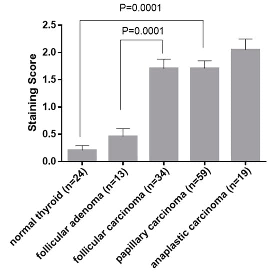 We have previously identified that G-protein coupled receptor-associated sorting protein 1 (GASP-1) is a ubiquitous tumor marker and required for cancer progression and invasion [23,24,25,26,27,28]. One of our recent studies showed that GASP-1 promotes proliferation and invasion of the triple negative breast cancer cell line MDA-MB-231 [26]. Furthermore, it was demonstrated that a polyclonal antibody against the specific GASP-1 peptide EEASPEAVAGVGFESK inhibited growth and reduced the size of MDA-MB-231 cell colonies in soft agar by more than 90%. GASP-1 has not been previously reported as a thyroid cancer biomarker. In the current study, we analyzed the involvement of GASP-1 in the development and progression of thyroid neoplasms. For this work, we used thyroid tissue microarrays containing normal thyroid tissue, follicular adenoma, follicular carcinoma, papillary thyroid carcinoma, and anaplastic carcinoma.