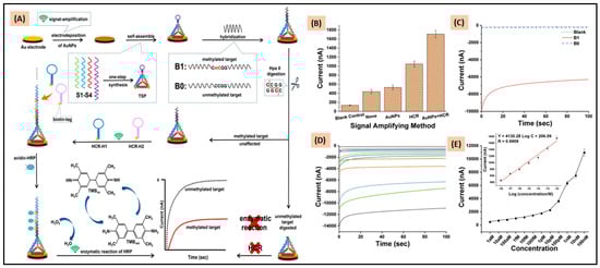 The P53 tumor suppressor gene, the most frequently methylated gene in the human genome, plays a major role in carcinogenic processes [43]. When its CpG island, in the promoter region, is unusually methylated, downstream genes are sliced steadily, which is a major cause of cancer. To detect p53 methylation, an electrochemical sensor that uses bisulfite conversion was developed. Peptide nucleic acid (PNA) was used as the capture element and [Ru(NH3)6]3+ was used as an electroactive material. The p53 gene was first treated with bisulfite conversion, which changes the Watson–Crick base-pair behavior of methylated and unmethylated p53 genes, allowing the complementary DNA probe to easily capture methylated genes by hybridization. The unmethylated genes, however, are not recognized by the DNA probe and therefore are not captured. This method can detect the methylated p53 gene at concentrations as low as 18 pM [44]. In another electrochemical study, sandwich electrochemical genosensors were designed for the detection of gene-specific methylation using Fe3O4/N-trimethyl chitosan/gold (Fe3O4/TMC/Au) nanocomposites for tagging the DNA probe and polythiophene as the sensing element sensing platform. The detection limit of this method under optimal conditions was 2 fM [45]. Zhou et al. constructed a ratiometric electrochemical biosensor for the sensitive detection of methylated DNA with a multi-step DNA amplification circuit. The proposed method is highly sensitive and can detect concentrations as low as 4 aM [46]. Tetrahedral DNA-based capture probes are often used to detect methylated DNA as they can easily find the target and exhibit minimal non-specific adsorption, ordered orientation, and controlled spacing. Chen et al. constructed a stem–loop, tetrahedron, composite DNA-capturing probe attached to an Au nanoparticle-coated gold electrode. This design consisted of a restriction enzyme digestion of HpaII, signal amplification, electrodeposition of Au nanoparticles, hybridization chain reactions, and horseradish peroxidase enzymatic catalysis. The sensor showed a LOD of 0.93 aM [47]. The design, construction, and results of the biosensor are shown in Figure 1. A different sensor using padlock-probe, primer-generating, rolling circle amplification (RCA) was used for the ultra-sensitive electrochemical detection of methylated DNA. A linear padlock, circulated after bisulfite treatment of methylated DNA, served as a template containing a DNA tetrahedron for RCA. The DNA tetrahedron immobilized onto a gold electrode was used as a nanocarrier. This method achieved a LOD of 0.1 aM [48]. A graphene oxide (GO)-based sensing platform has also been explored for the detection of methylated DNA. Anti-5-methylcytosine antibody was immobilized with GO, which bound to CpG methylation sites with high specificity. An IgG secondary antibody labeled with horseradish peroxidase (HRP-IgG) later bound to it. In the presence of H2O2, the HPR-IgG oxidized the hydroquinone into benzoquinone, which caused electrochemical signal changes. The concentration of methylated DNA was directly proportional to the change in the electrochemical signal, which led to the quantification of the methylated DNA at concentrations as low as 1 fM [49].