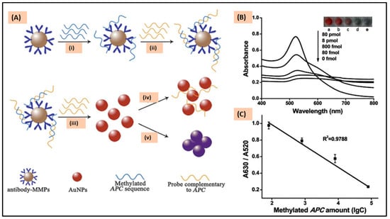 (A) A pictorial representation of methylated adenomatous polyposis coli (APC) sequence detection mechanism: (i) in the first step, methylated APC target sequence was captured by immobilized MMPs; (ii) a partial complementary to the target probe was introduced to form partial dsDNA duplex; (iii) the captured probe dissociated from the hybrid-conjugated microspheres by heat denaturation; (iv) AuNp was used as a probe to detect the released target sequences. There is no significant change in the solution (red) after NaCl was added. (v) Since there are no methylated APC target sequences, and the functionalized MMPs did not capture the unmethylated APC and there was no duplex formation, therefore, the color of the solution changed from red to purple rapidly. (B) Colorimetric detection of methylated APC sequence and the change in the absorption spectra of AuNps with different concentrations of APC in the range of 80 fM to 80 pM. (C) Calibration plot of absorbance ratio against the target. The error bar indicates the standard deviation of the results from four different experiments. Adopted from [51], with copyright permission under the terms of the CC-BY-NC-ND 3.0 license.