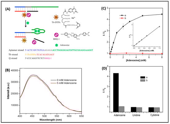 Another strategy reported for adenosine detection is based on the luminescence phenomenon. Luminescence biosensors use the emission of light by specific chemical compounds in response to adenosine binding to a corresponding antibody on the sensor surface [98]. Li et al. reported a turn-ON luminescent aptasensor for the sensitive detection of adenosine in undiluted serum samples. Luminescence resonance energy transfer (LRET) between the terbium complex and BHQ1 quencher was utilized to detect adenosine. Three types of DNA oligonucleotides were used in this design: a Tb3+ chelated complex-labeled DNA, a quencher-labeled DNA, and an aptamer DNA. The aptamer DNA was extended to hybridize the Tb-labeled DNA with the quencher-labeled DNA. In the absence of adenosine, the sensor emitted a small amount of light; however, in the presence of adenosine, the DNA conformation switched, increasing emission. The LOD of this method was 60 µM [99]. The schematic representation of LRET between the donor and the acceptor is shown in Figure 4. A dose-dependent fluorescence signal and the cross-reactivity of the aptasensor with closely associated molecules are illustrated. Sun et al. reported a chemiluminescent biosensor for the sensitive and selective detection of adenosine under alkaline conditions using carbon-quantum-dot-catalyzed luminol-H2O2 system emission. The carbon quantum dots released from the surface of the aptamers activated a graphene/magnetic β-cyclodextrin polymer complex. The adenosine concentration can be measured in the range of 5 nM to 0.5 pM, with a LOD of 0.21 pM [100].
