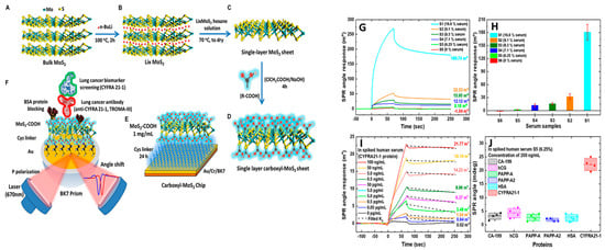 (A) Water-dispersible bulk MoS+; (B) Li intercalated MoS2 (LixMoS2); (C) MoS2 in a single layer; (D) single-layered carboxyl-MoS2 nanocomposites; (E) the carboxylated-MoS2 SPR chip; (F) SPR sensing mechanism for the detection of CYFRA21-1 from carboxylated-MoS2 SPR chip. SPR sensorgram of CYFRA21-1 spiked in human serum measured from carboxylated MoS2 SPR chip; (G) Dose-dependent sensorgram of SPR for different serum concentrations. (H) The SPR signal for variable serum ratios. (I) Quantitative detection of CYFRA21-1 protein spike in S5 buffer with different concentrations from SPR signal changes; (J) The specificity test of the SPR sensor with non-specific biomolecules. Adapted from [114].