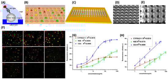 (A) Schematic representation of bead-based array detection method for the detection of three different lung cancer biomarkers using QDs. (A) Illustration of bead-based sandwich assay; (B) three different colored spots after sandwich complex on the chip. (C) The chip pattern; (D) SEM image of the microarray on a silicon wafer. (height = 9 μm); (E) SEM image of micro holes on PDMS with a diameter of 10 μm and spaced 10 μm apart from each other; (F) fluorescence microscopic image of the three different lung cancer biomarkers for simultaneous detection. The concentration range of antigen was 0.46–1000 ng/mL with an exposure time of 0.4 s; (G) the plot of fluorescence intensity against the logarithmic concentrations of CYRFA 21-1, NSE, and CEA in the multiplexed assays; (H) the standard calibration plot for the three cancer biomarkers. Adapted from [115], with copyright permission under the terms of the CC-BY-NC-ND 3.0 license.